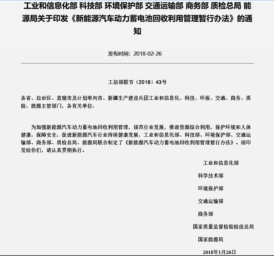 2018年2月26日,工业和信息化部联合各部委发布《新能源汽车动力蓄电池回收利用管理暂行办法》(以下简称《管理办法》),并明确将自2018年8月1日起正式实施。“动力电池溯源”责任主体为新能源汽车生产企业。