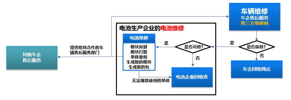 电池维修的总体流程图如下图所示。根据《办法》中第十二条规定,“汽车生产企业应建立动力蓄电池回收渠道,负责回收新能源汽车使用及报废后产生的废旧动力蓄电池”。新能源汽车的动力电池在维修时,若不处于保修状态,且经鉴定认为应当退役,则进入车企回收网点,集中贮存并移交至与其协议合作的相关企业。
