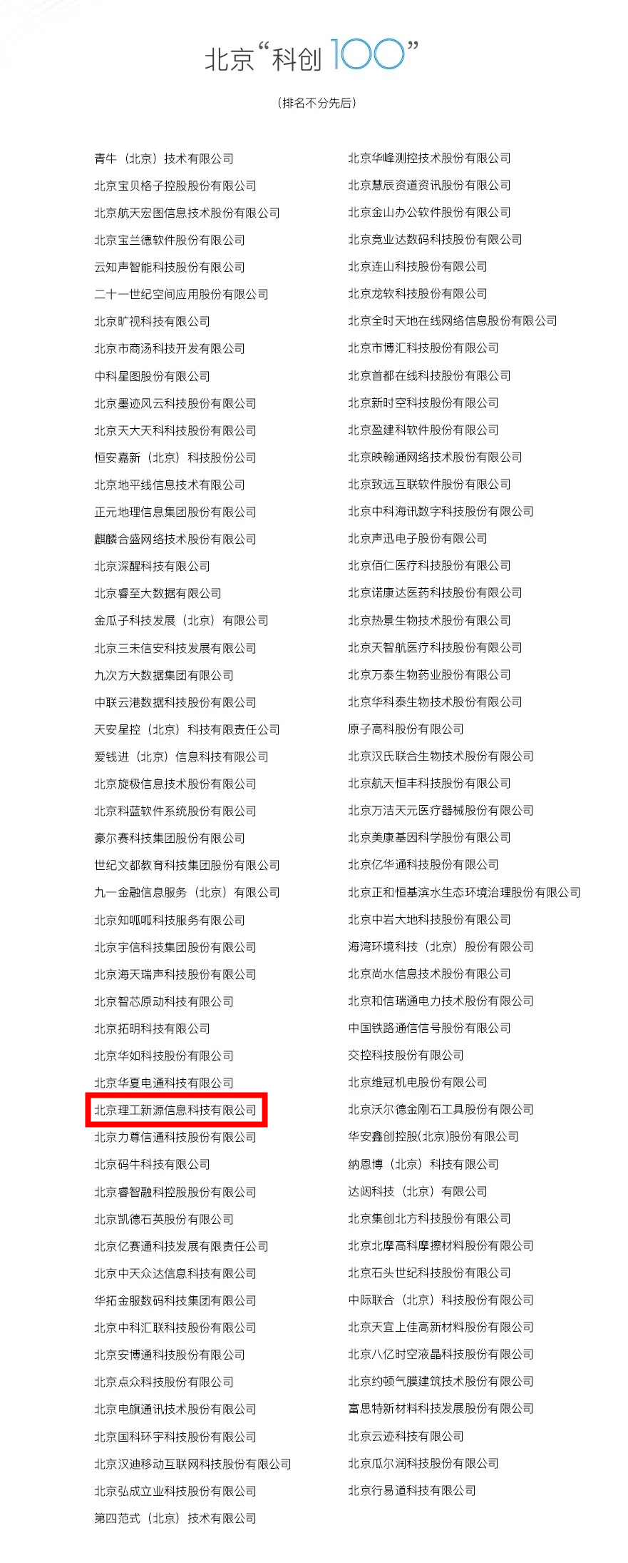 2019年10月18日,2019中关村论坛之“多层次资本市场助力首都科技创新发展”平行论坛在京举行。论坛发布了北京“科创100”企业名单,作为中国新能源汽车运行监管龙头、专业从事车联网大数据应用服务的领军企业“北理新源”成功上榜,成为首批示范企业。