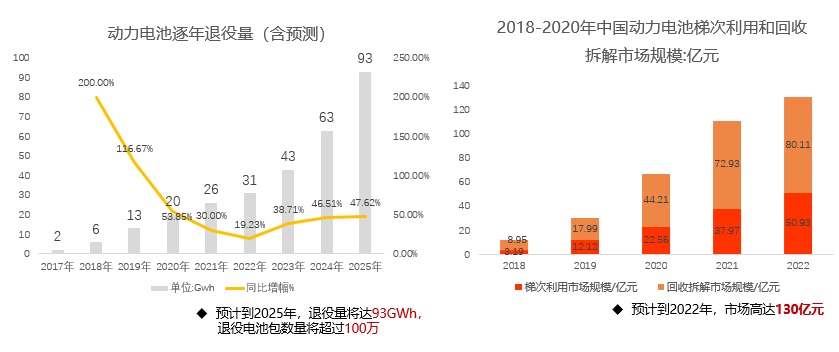 众所周知,从2009年到2018年,新能源汽车经历了爆发式增长。按照一般整车厂电池8年衰减20%的质保能力,从2017年开始迎来了动力电池退役数量的快速增长。预计2025年退役电池将达到93GWh,每年退役电池包数量将超过100万量级。由此,将带来巨大的电池梯次利用潜市场价值。