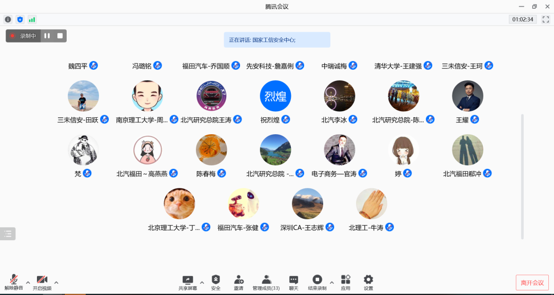 会上,国家工业信息安全发展研究中心作为本项目的牵头单位对项目总体概况、任务分工和管理要求等工作做了重点介绍,北理新源、北汽福田等单位代表分别就各自优势、已有工作基础、本单位任务规划与分工等做了汇报。为更好地保证本项目高质量完成,国家工业信息安全发展研究中心牵头成立项目专家组,为项目实施提供全过程专业指导,北京理工大学网络空间安全学院党委书记祝烈煌、清华大学车辆与运载学院党委书记王建强、南京理工大学网络空间安全学院院长周永彬、中国汽车工业协会秘书长助理王耀、北京中瑞诚联合会计师事务所副所长梅贵琴等专家组成员代表分别对项目提出建议。