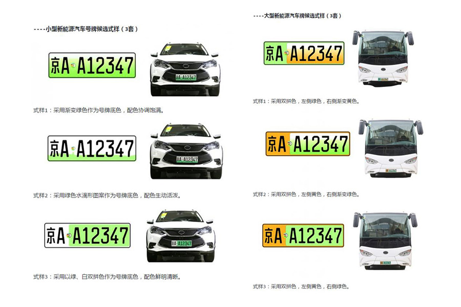 为促进新能源汽车发展,更好区分辨识新能源汽车,实施差异化交通管理政策,中国公安部在今年4月向公众征集新能源汽车专用号牌式样设计意见。经过初步测试、筛选和论证,其中,小型汽车号牌和大型汽车号牌各3个式样。(如下图)