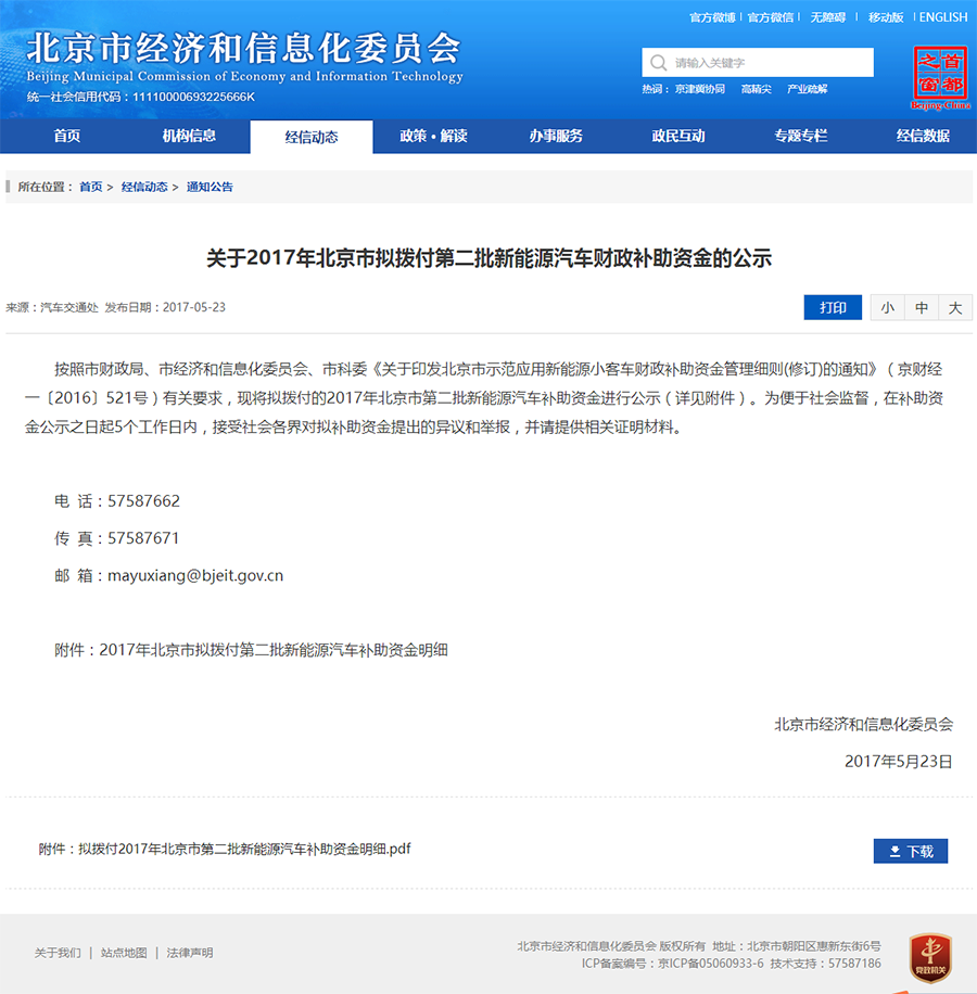 近日,从北京市经信委了解到,北京市发布《关于2017年北京市拟拨付第二批新能源汽车财政补助资金的公示》,2017年北京市拟拨付第二批新能源汽车补助资金共涉及5745辆,拟拨付资金30604.54万元。