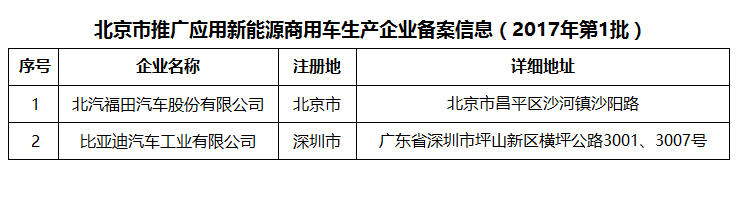 、《北京市推广应用新能源商用车生产企业备案信息(2017年第1批)》。