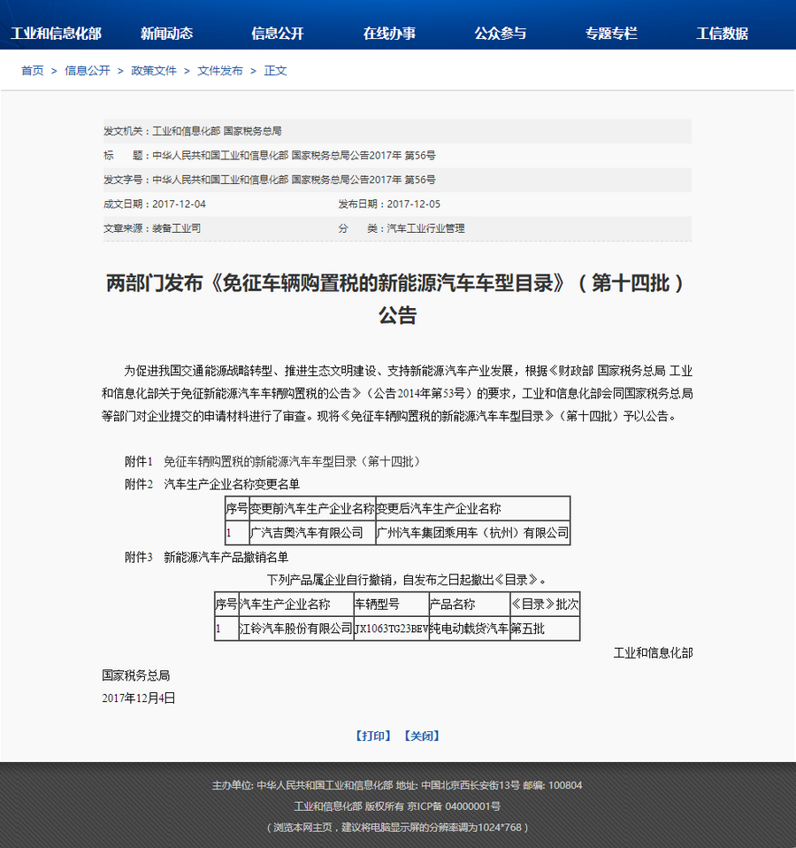 2017年12月4日,工业和信息化部、国家税务总局两部门发布《免征车辆购置税的新能源汽车车型目录》(第十四批)公告,共158款车型入选。纯电动汽车143款(包含乘用车26款、客车49款、货车1款、专用车67款),插电式混合动力汽车13款(包含乘用车5款、客车8款),燃料电池汽车2款(客车)。
