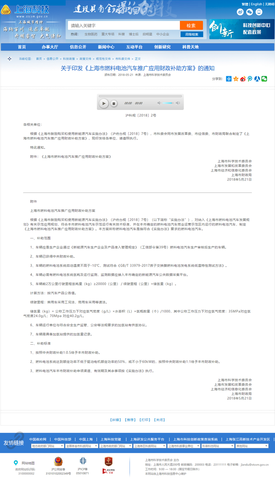 上海市发布燃料电池汽车补贴政策 最高按中央1:1给予补助